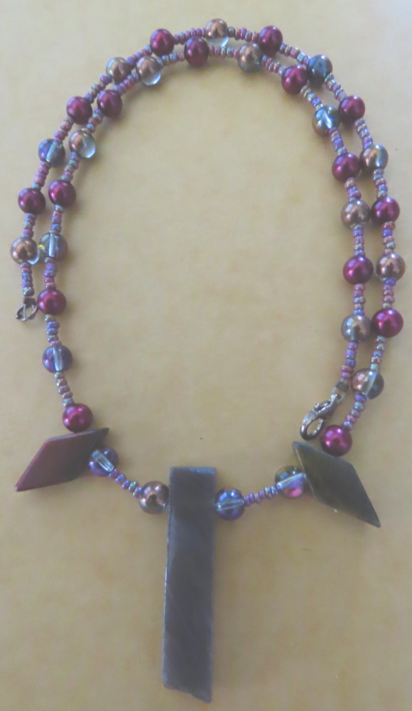 I'm glad this photo showed off the colors in the necklace. They're not very strong in life, usually only the red balls are noticeable. But I had 3 leftover stone pieces and was trying to get something to capture their shades, so used a bi-color light purple ball, the reds, and a purple seed bead mix.