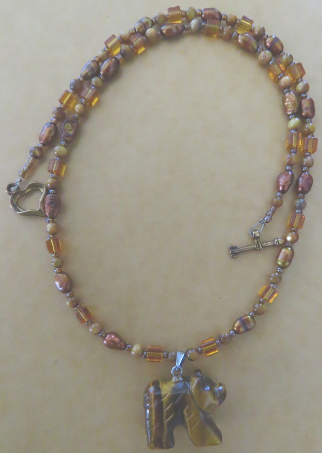 Went with different color shades for the Tiger's Eye bear, with a mix of glass, freshwater pearls and shells.