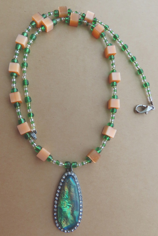 Not sure what they're actually called but the center in the compass pendant and the oval one have what seems like a multicolored foil interior that looks orange, green or both depending on the light. You can see the orange a bit above and mostly green below.