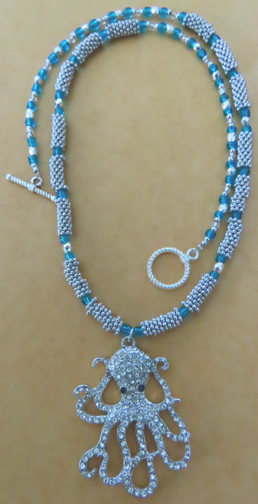 I wanted something a little rough looking to go with this because the octopus is so shiny. Didn't have anything that fit the bill which was the right size, and I wanted to make this a bit longer of a necklace. So I used groups of metal bead ends along with some blue E beads for the ocean angle.